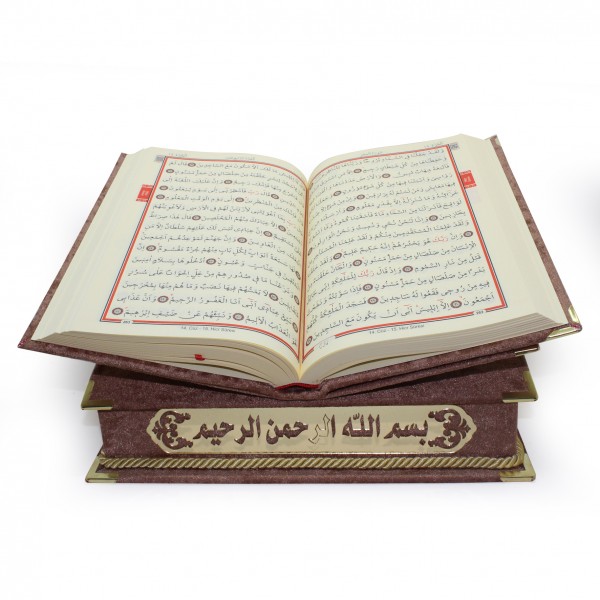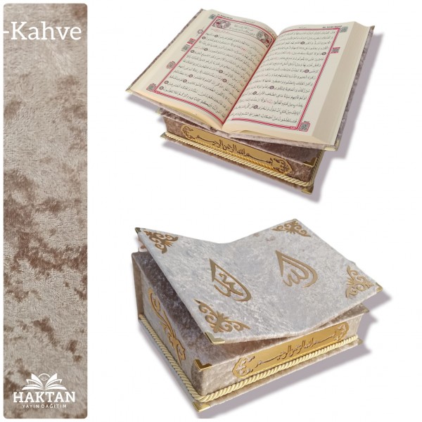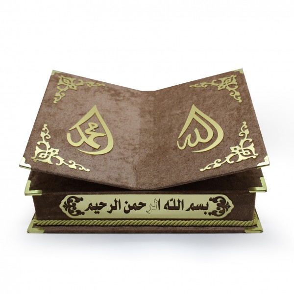 MASAÜSTÜ RAHLE ÖZELLİKLİ İSME ÖZEL ORTA BOY KADİFE KAPLI KUR'AN-I KERİM İNCİ TESBİH HEDİYELİ KAHVERENGİ
