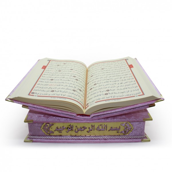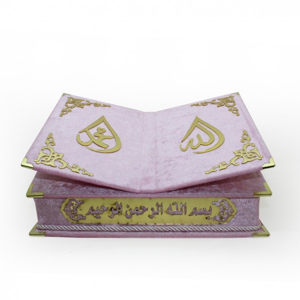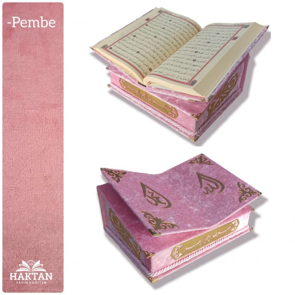 MASAÜSTÜ RAHLE ÖZELLİKLİ İSME ÖZEL ORTA BOY KADİFE KAPLI KUR'AN-I KERİM İNCİ TESBİH HEDİYELİ PEMBE